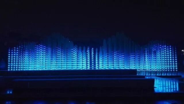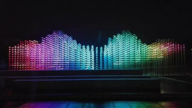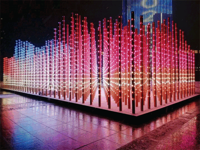 《山川新語(yǔ)》,作品長(zhǎng)20米,寬9米,最高點(diǎn)6米,占地面積180平米。以不同高度的鋼柱形成山形效果,在不同角度演繹不同的效果,形成大型步入體驗(yàn)式交互Led3D矩陣。